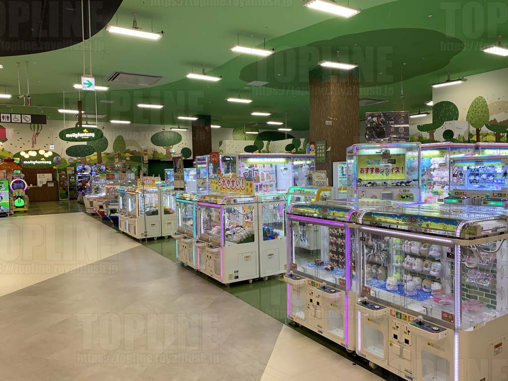 店舗の前面にプライズが並び、アーケードはキッズライド数台とマリカと太鼓のみ。