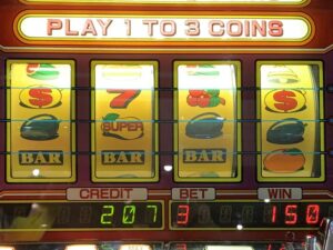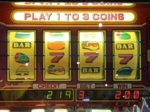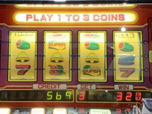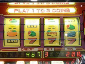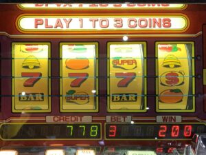 4リール、3ライン、「7777」が3番ラインに揃うと3000枚のボーナスが付くメカスロ。
